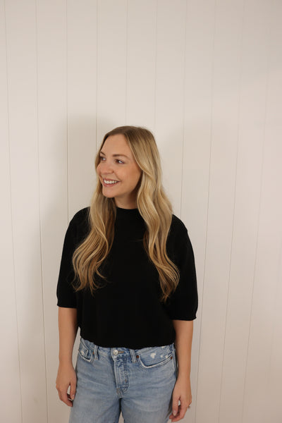The Hazel Sweater in Black features an elegant sleeve length and a slightly cropped fit, offering a refined silhouette that pairs effortlessly with both tailored and casual looks. Crafted for a sophisticated touch, this sweater balances comfort with polished style, making it a versatile addition to your wardrobe.